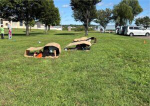 次は段ボールで作られた無限軌道の中に人が入り、自ら回転させて進む種目です。人間キャタピラーとでもいうんでしょうか。4台のキャタピラーが用意され、スカウトが次々と乗り込み、ゴールに向かって突っ込んでいきます。伊之助ばりの猪突猛進です。突進しすぎて隣のキャタピラーに接触し、2台同時停止!なんてこともしばしば。前が見えない暴走特急は恐ろしい。
